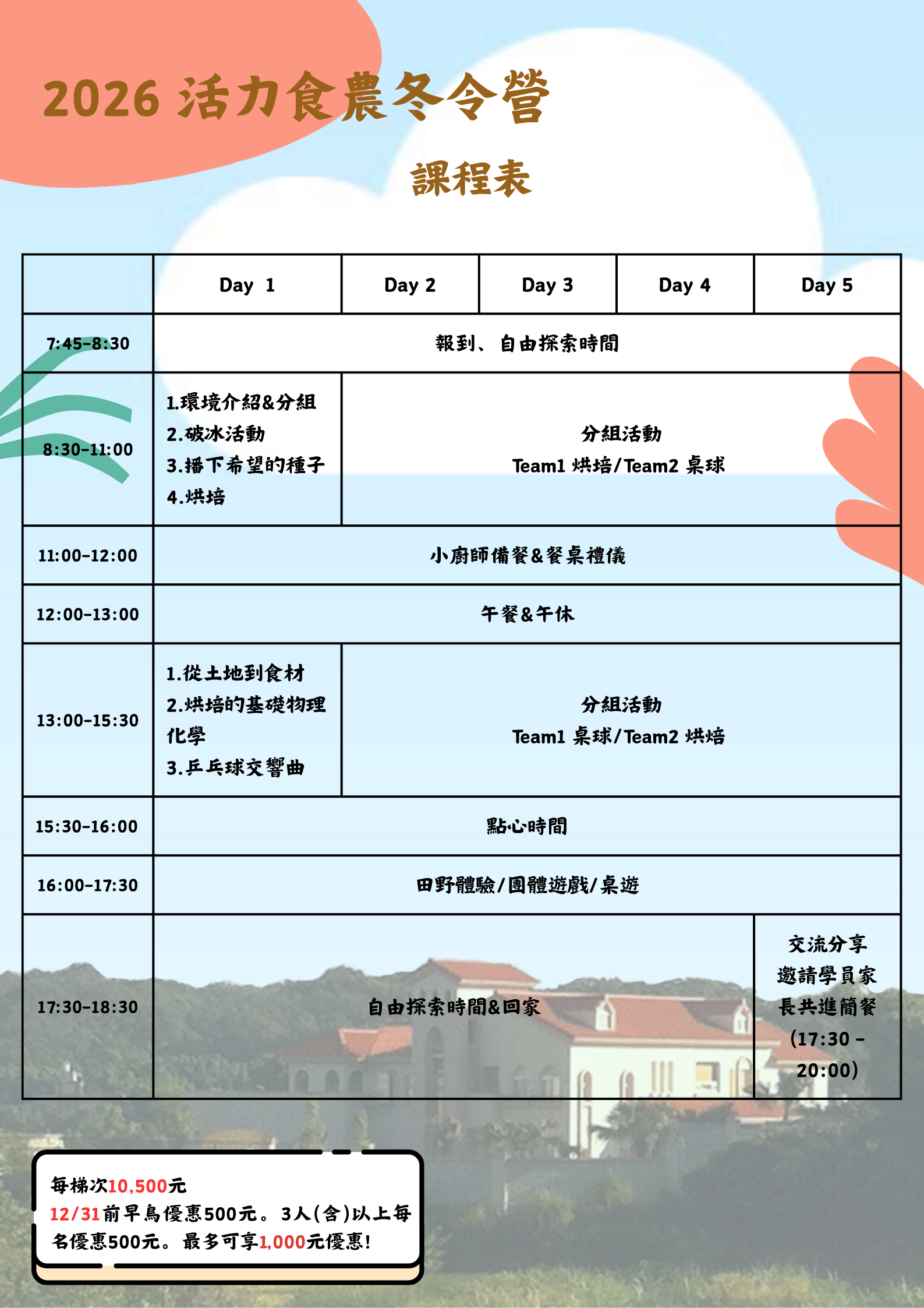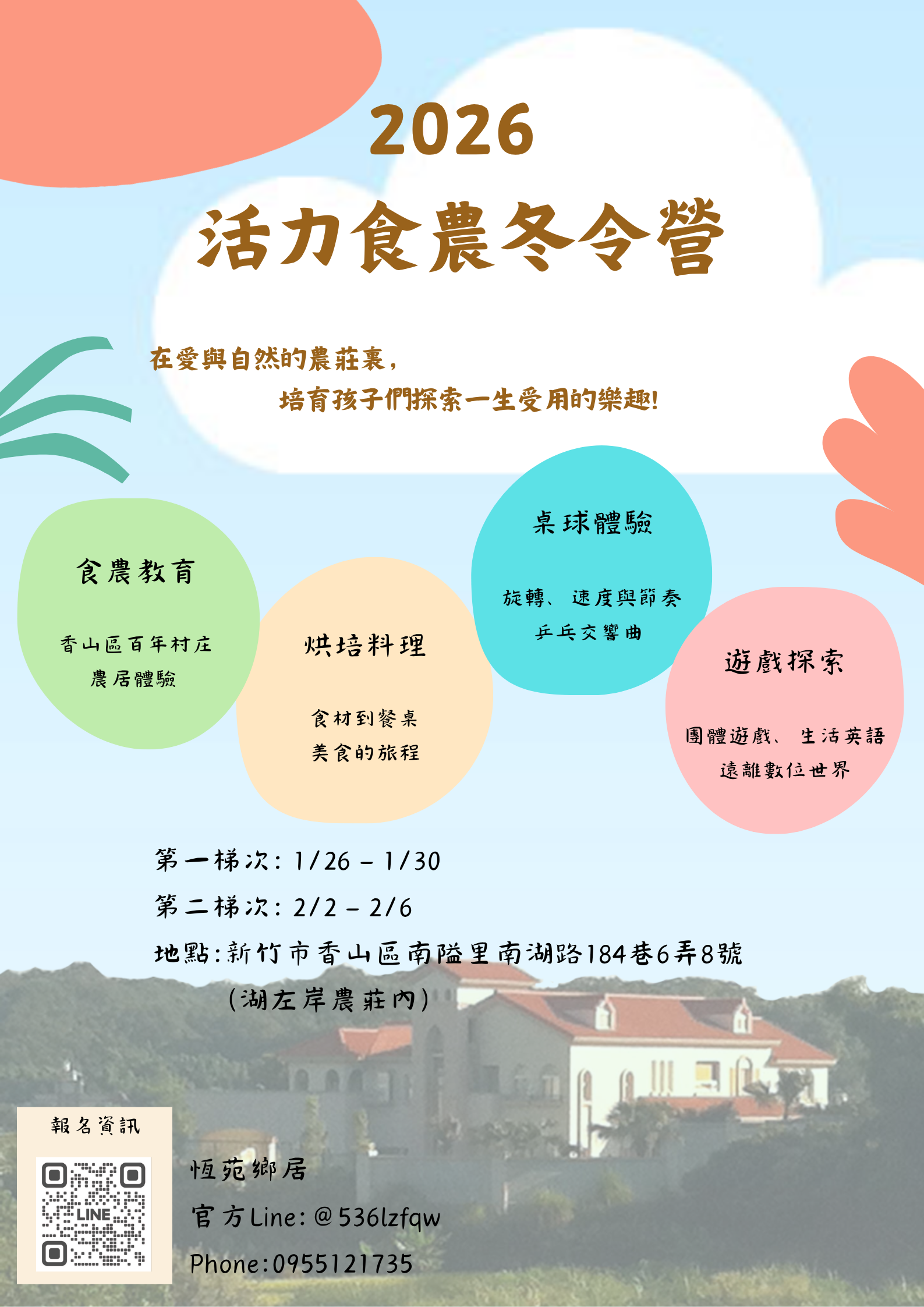 2026 活力食農冬令營 招生中在愛與自然的農莊裏,培育孩子們探索一生受用的樂趣! 自有農舍農場,環境清幽舒適課程有趣豐富,溫馨小班制師資優質、愛心教學交通方便,近距離享受田園風光餐飲多元豐富、食農餐桌體驗 直接報名 加入官方LINE了解更多